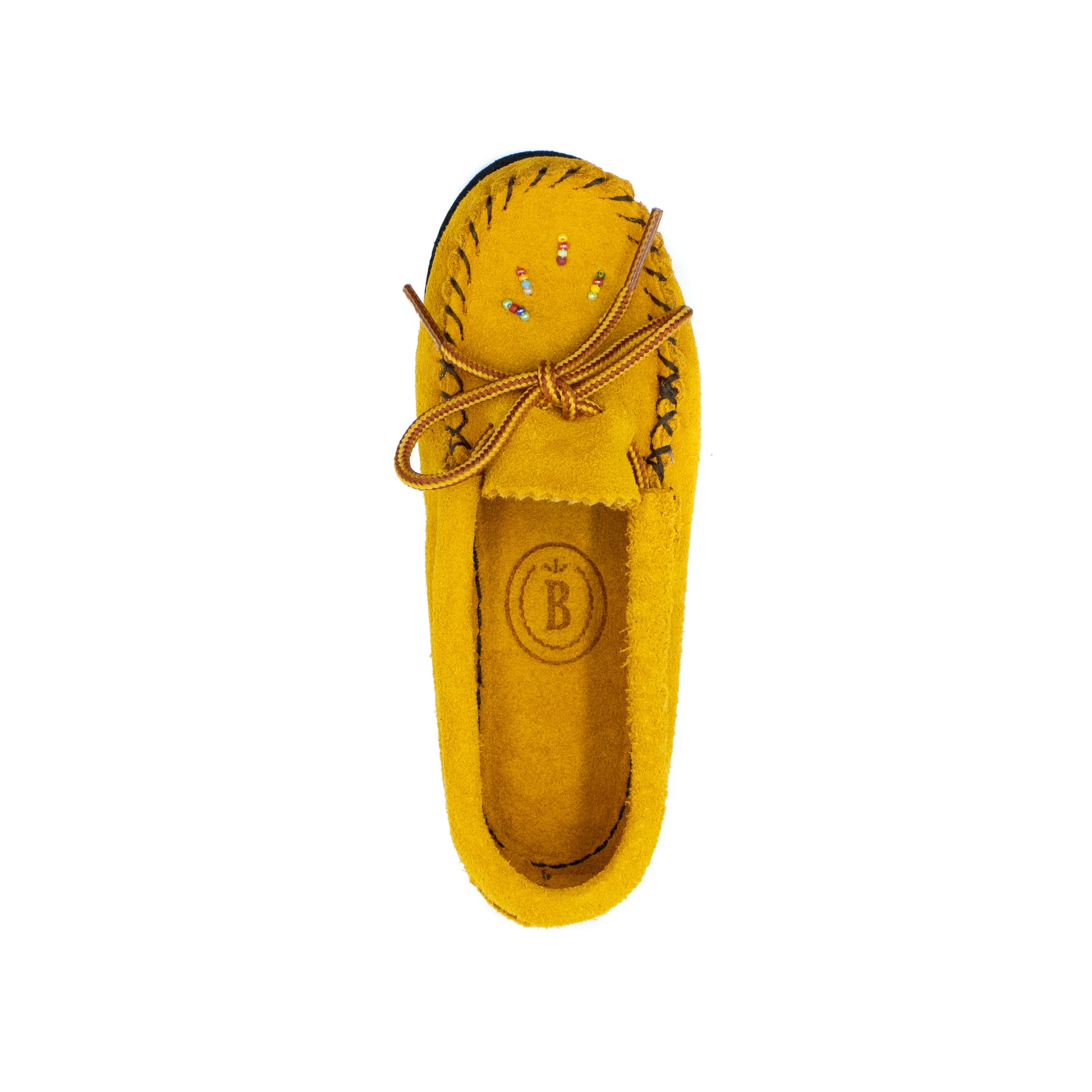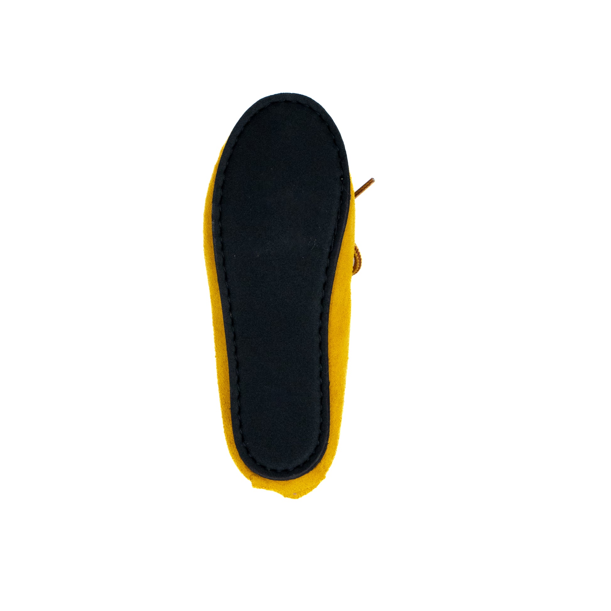These traditional Junior moccasins are handmade using genuine suede leather, which is both soft and durable. They make a great indoor house shoe or can be worn outdoors as they have a durable soft rubber sole.