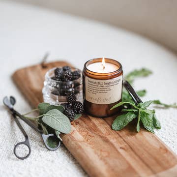 Beautiful Beginnings: blackberry•sage•cypress•mint Key scent notes: blackberry•sage•cypress•mint Label name: beautiful beginnings Scent family: fresh, nature, cozy, fruity Size: 8 oz (227g) Colours: amber glass jar, black lid with foam insert, kraft recycled label Burn time: 50+ hours Ingredients: 100% pure soy wax, clean burning—not soot with premium wick hand poured in small batches to ensure the highest quality