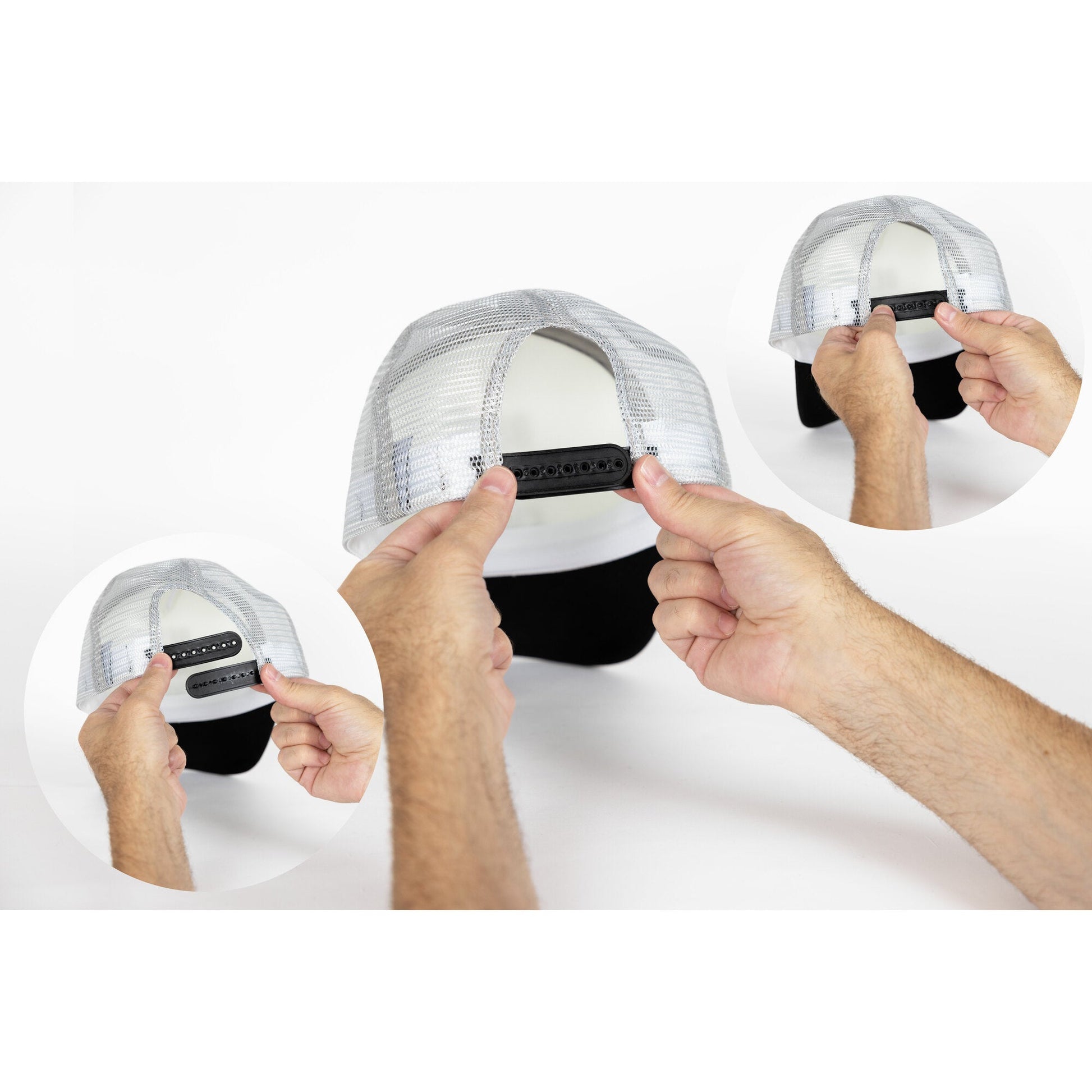 - PREMIUM QUALITY: This adjustable snap back trucker hat has a plastic strap with 7 adjustable settings. The cotton black brim, white neoprene upper, and gray mesh sides are all sewn together to construct the baseball cap.