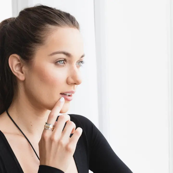 BREEZE - Modest and tasteful, let the BREEZE ring™s light presence carry you through each day! HIGH-QUALITY - Made of 925 sterling silver and stamped with 925, the clean-looking base ring forms the perfect platform for the brass and copper spinners to rotate effortlessly. LIGHTWEIGHT - The Breeze ring is one of our lighter spinner rings, weighing 6 grams for a size 8 ring. The edge of the ring is folded in to make the ring sturdy and comfortable to wear. PERFECT FIT “ All our Energy Stone rings are made true to size with extra room to accommodate the swelling of fingers, which guarantees high comfort throughout the day. DISTINCTIVE AND UNIQUE “ Our spinner rings are handmade and crafted exclusively in our Energy Stone artisan studios.