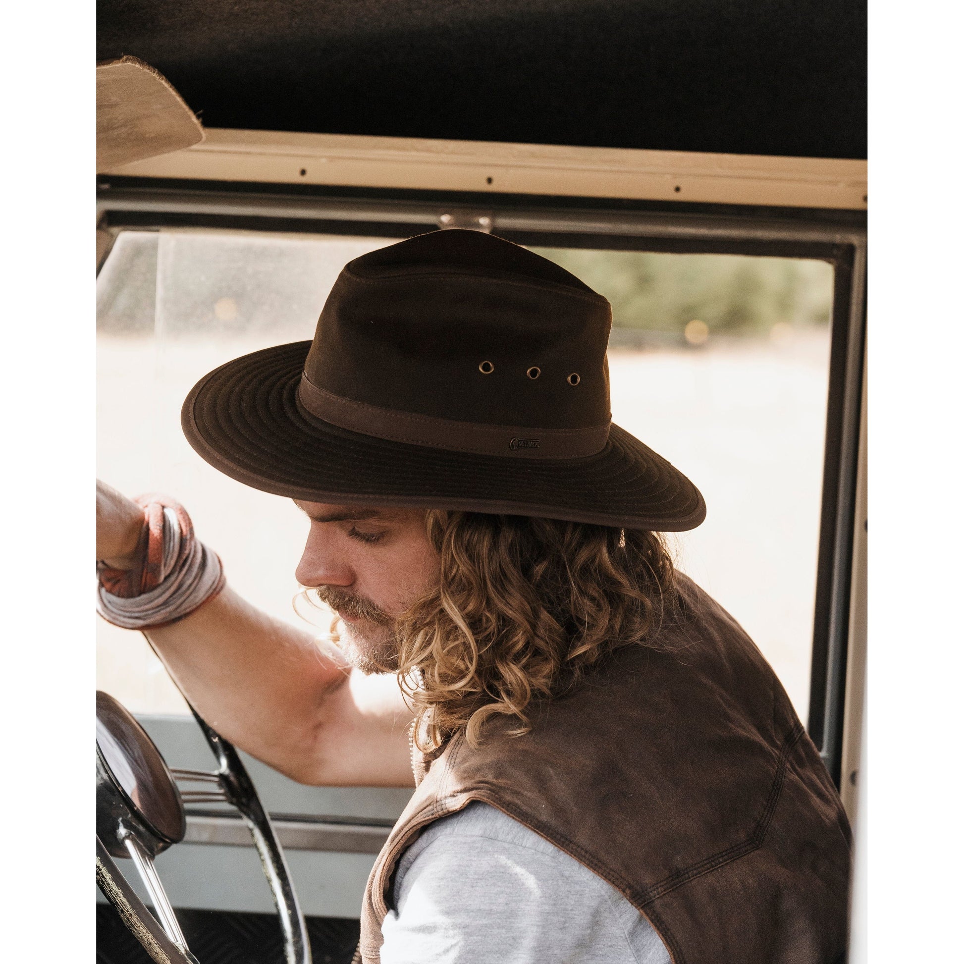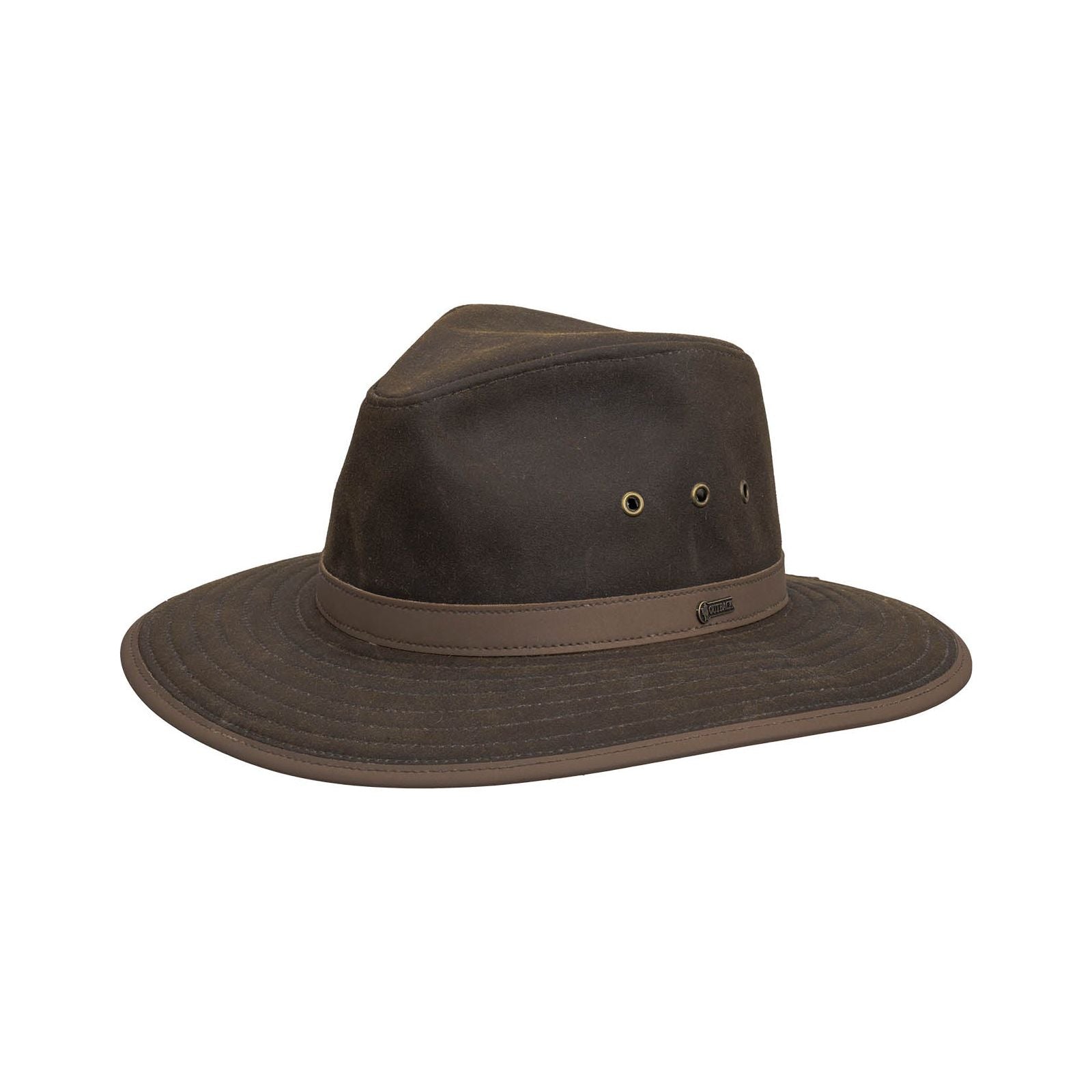 This stunning Bronze Oilskin hat is beautifully finished with leather accents on both the brim and headband.