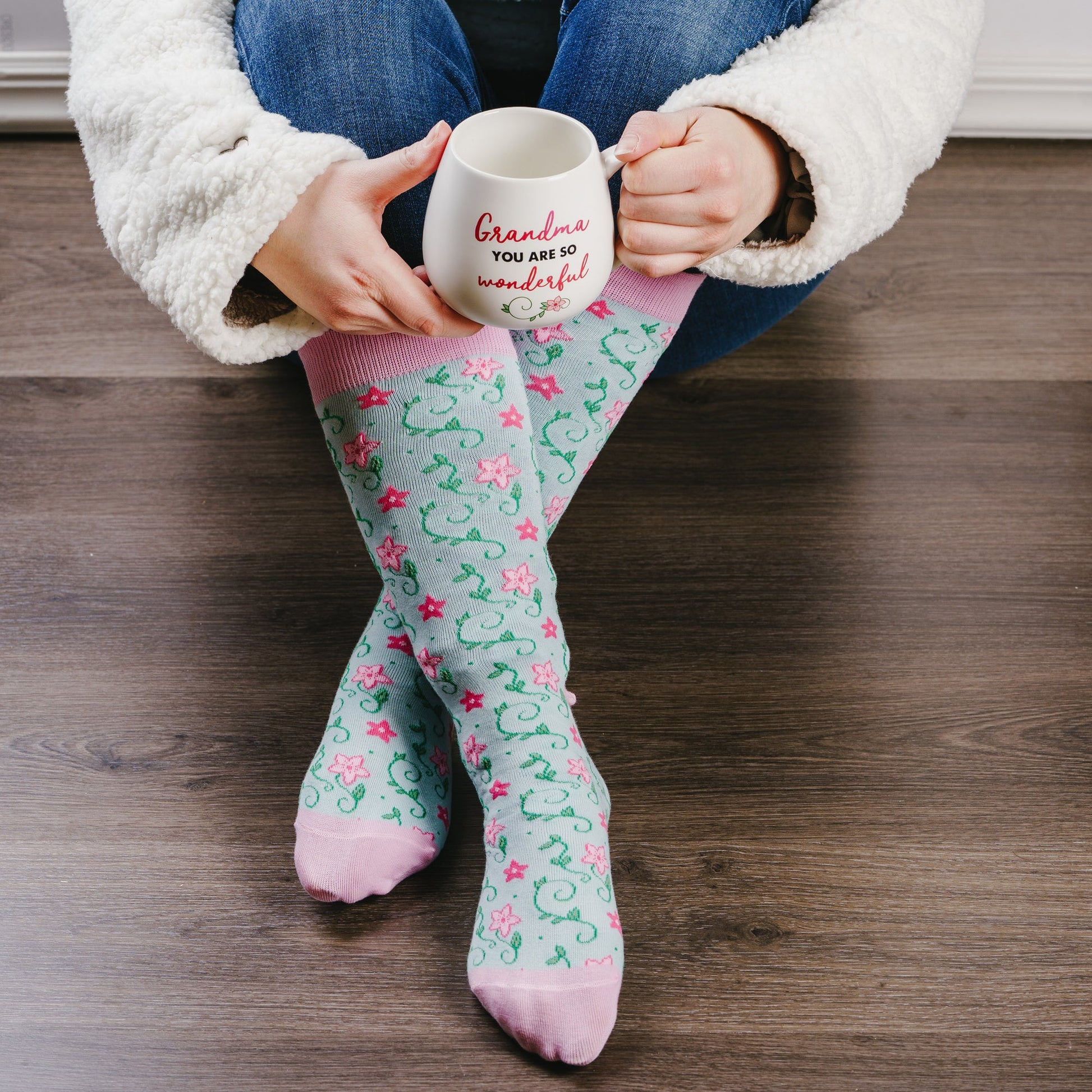 - "Grandma You Are So Wonderful" text and accompanying design is printed onto the front of the mug, while the socks feature a sewn-in floral pattern.