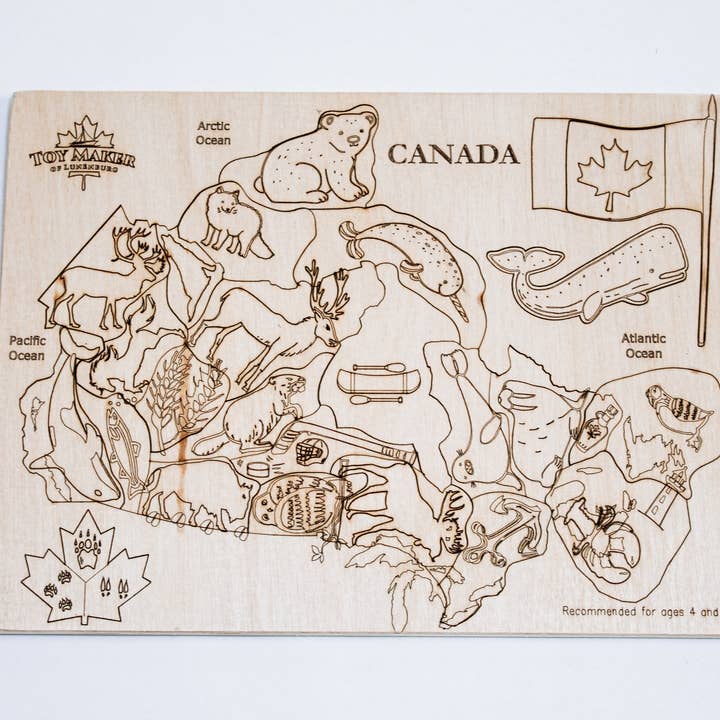 Fun Canada map inlay puzzle with iconic native animals – handmade in Canada gift for children Discover iconic Canadian animals and the geography of Canada with this unique and challenging map puzzle. Handcrafted in Canada, this sturdy puzzle will provide hours of fun as both parents and children map out Canadian wildlife, such as the narwhal, puffin, bison, and more! When complete, lift the pieces to learn the regions of Canada. The lovely two-tone wood design also makes this puzzle a fun and educational piece of art. A perfect gift for your little explorer! The puzzle pieces consist of animals and Canadian icons. The bottom layer of the puzzle contains the Canada map with the Provinces boundaries and the Capital Cities of each Province. Made from plywood Recommended for Ages 4- 8 Dimensions (cm): 30 x 22 x 1 (11.3" x 8.5" x 0.5") Weight: 0.3 kg
