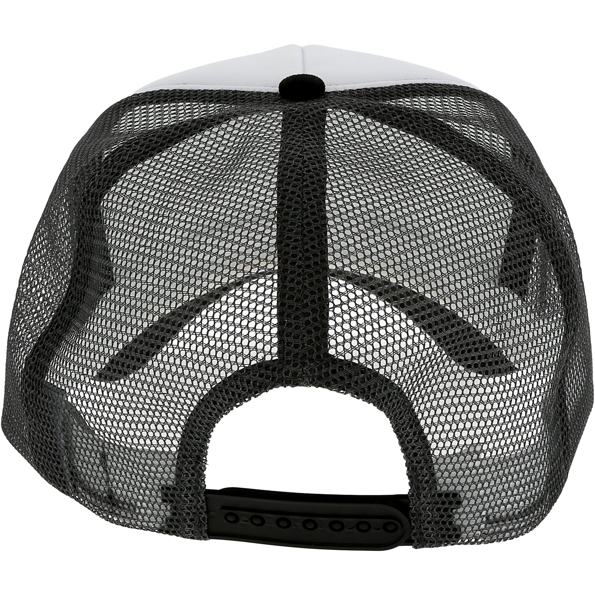 - PREMIUM QUALITY: This adjustable snap-back trucker hat has a plastic strap with 7 adjustable settings. The cotton black brim, white neoprene upper, and gray mesh sides are all sewn together to construct the baseball cap.