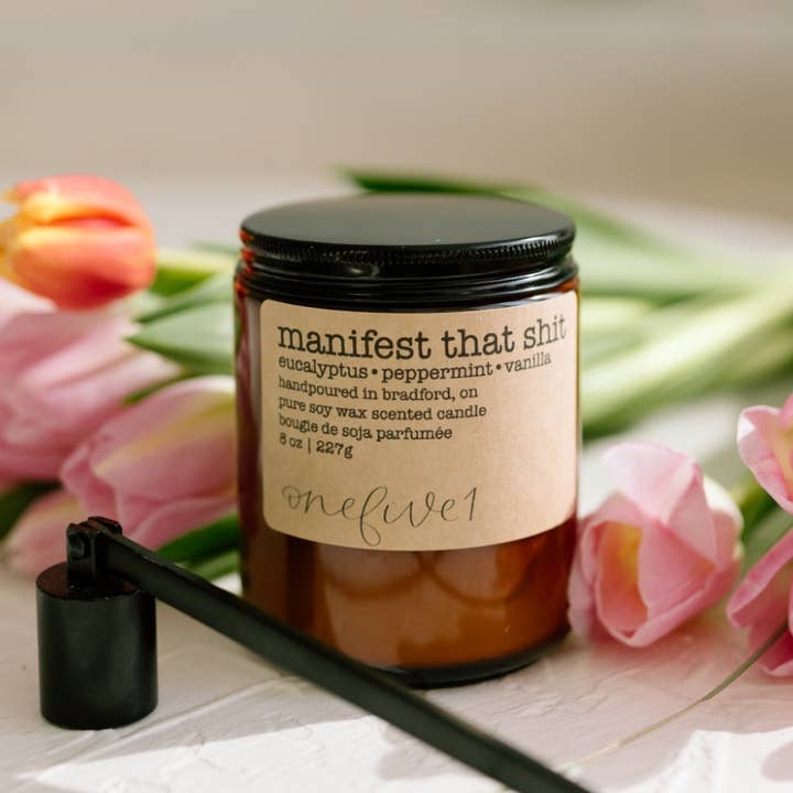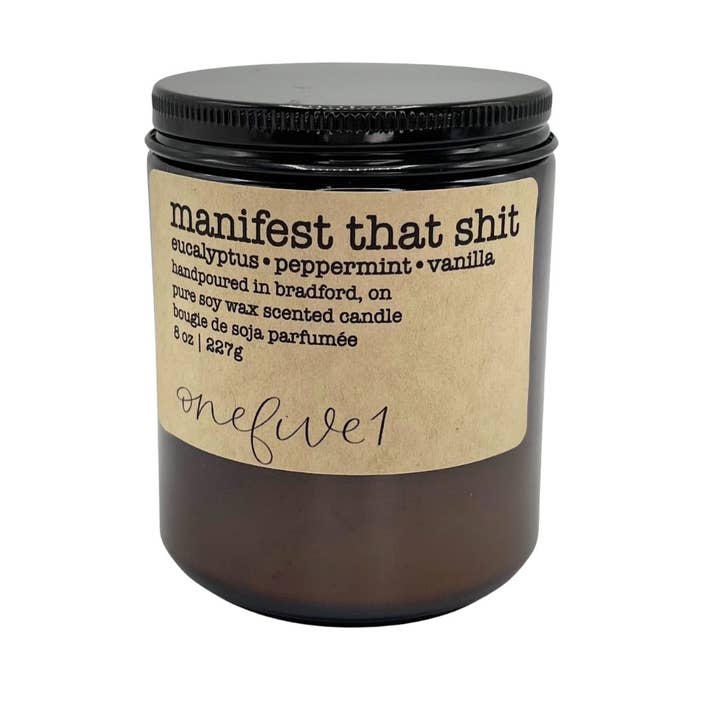 Manifest that shit: eucalyptus • peppermint • vanilla Key scent notes: eucalyptus • peppermint • vanilla Label name: manifest that shit Scent family: earthy, zen. calming, spa, fresh Size: 8 oz (227g) Colours: amber glass jar, black lid with foam insert, kraft recycled label Burn time: 50+ hours Ingredients: 100% pure soy wax, clean burning—not soot with premium wick hand poured in small batches to ensure the highest quality
