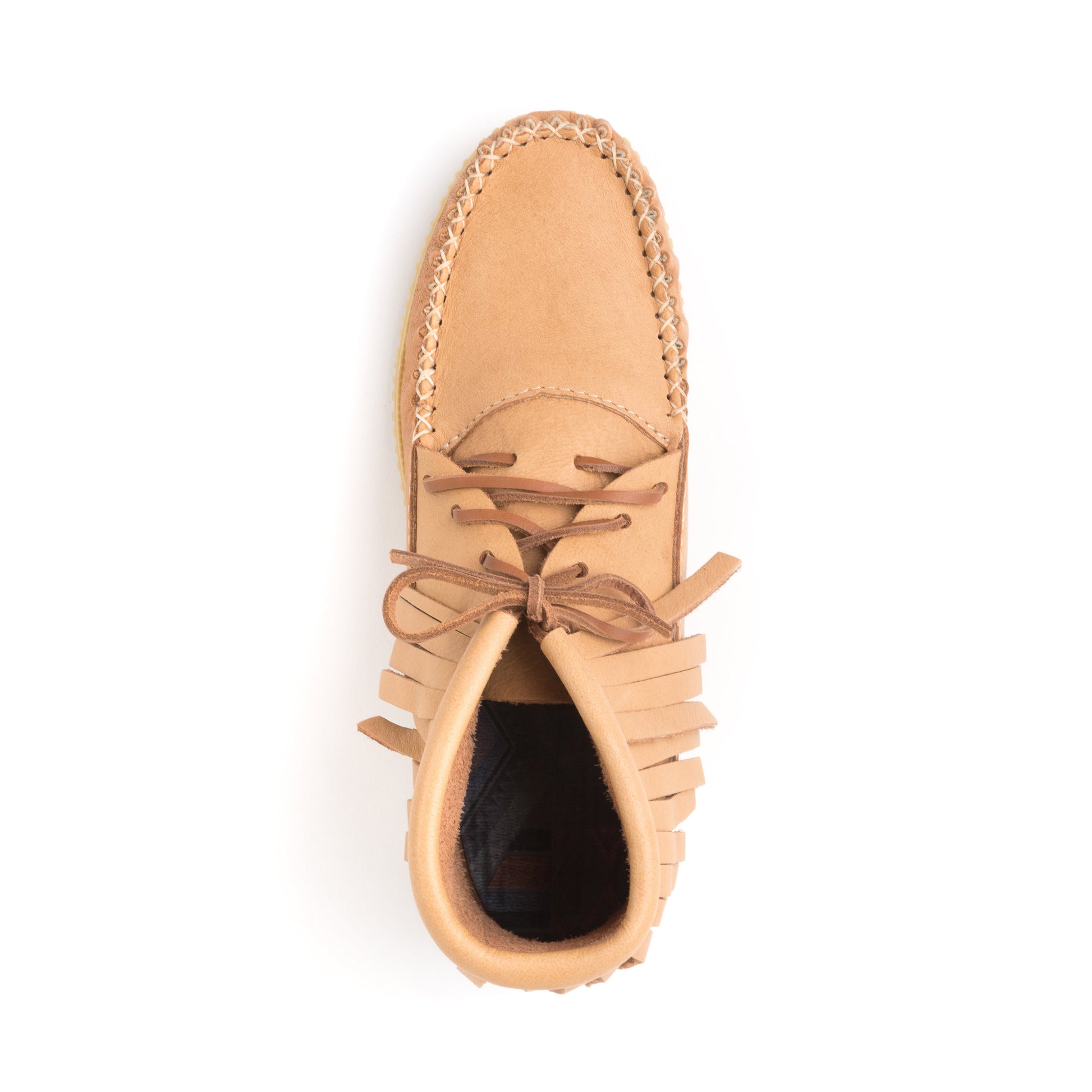 The A'ENDA' is a versatile moose hide boot, fringed with a rubber sole. It offers a snug fit and a little something that enhances a look!