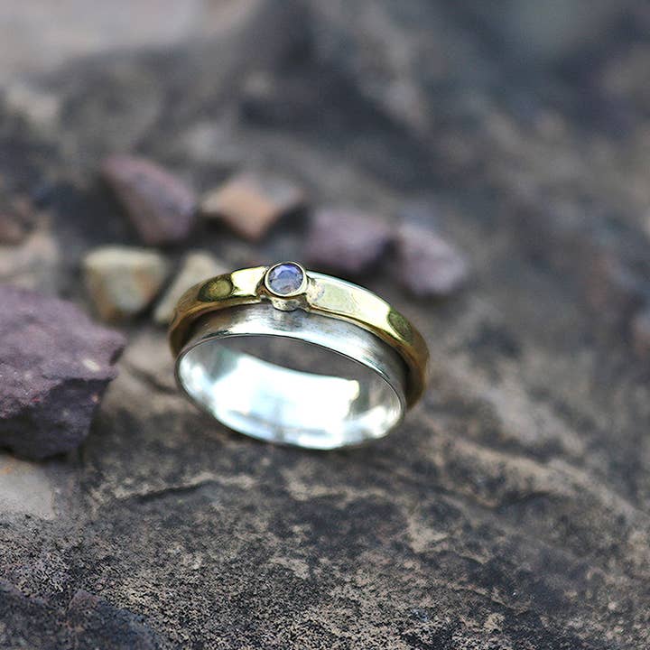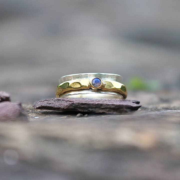 EACHER™S RING “ Set with a labradorite stone in the spinner band, this TEACHER™S RING exemplifies one™s ability to appreciate others and bring out their best. A subtle ring that can be worn for any occasion from day through the evening. HAMMERED PATTERN “ this ring features a 3mm cabochon labradorite bezel set in a hammered pattern brass spinner overlaying a 925 sterling silver base ring. KEEP CALM - Enhance your meditation practice and bring yourself a sense of calm throughout the day. Release nervous energies and restore balance as you spin. NARROW BAND “ the Teacher™s ring measures 6mm in height from knuckle to knuckle and is considered a narrow band ring.